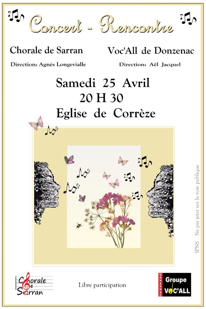 ConcertRencontre de la Chorale Voc’All de Donzenac diréigée par Aël Jacquel et de la Chorale de Sarran dirigéepar Agnès Longevialle. Chants sacrés et profanes de la Renaissance à nos jours –