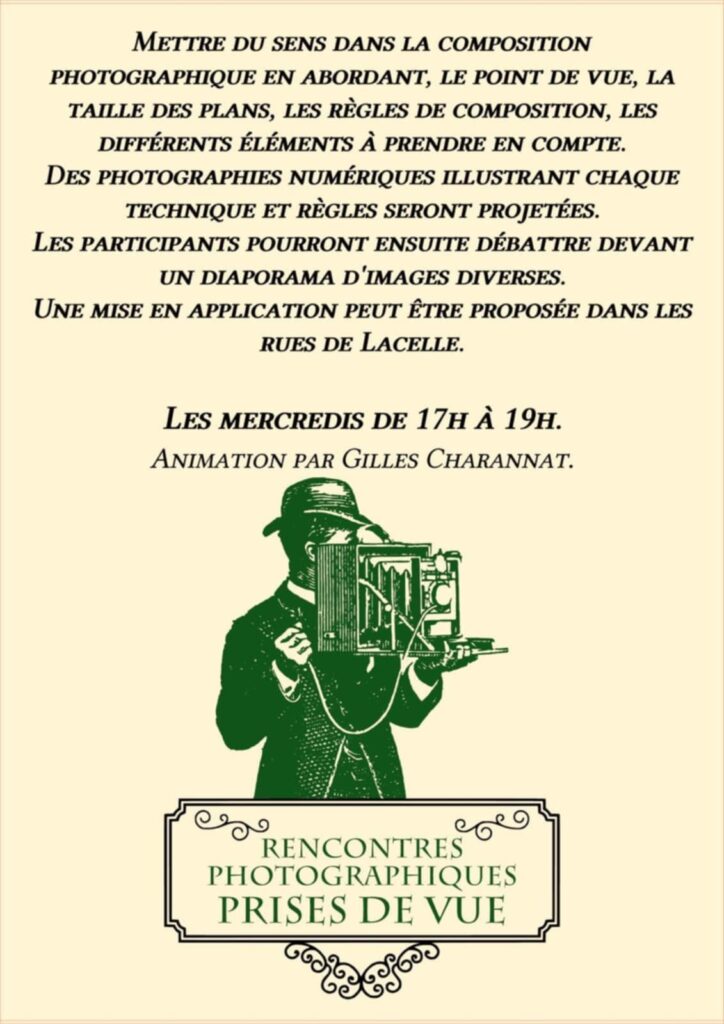 Des photographies numériques illustrant chaque technique et règle seront projetées. Les participants pourront ensuite débattre devant un diaporama d’images diverses. Une mise en application pourra être proposée dans les rues de Lacelle.