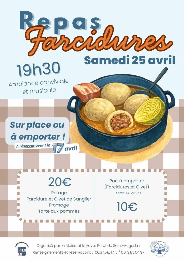 Animations localesAmbiance conviviale et musicale – Sur place ou à emporter – 20 € : Potage – Farcidures et civet de sanglier – Fromage – Tarte aux pommes – Part à emporter 10 € (farcidure et civet) à retirer entre 18 h et 19 h
