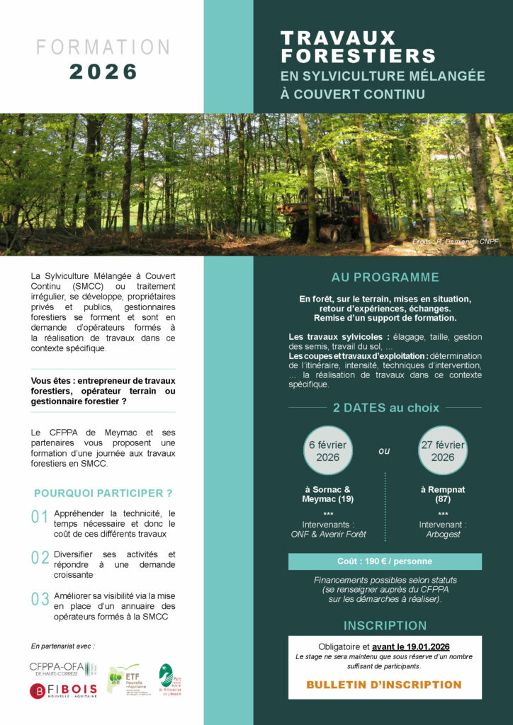 Cette formation s’adresse aux entrepreneurs de travaux forestiers, opérateurs terrain et gestionnaires forestiers souhaitant développer leurs compétences en SMCC.
