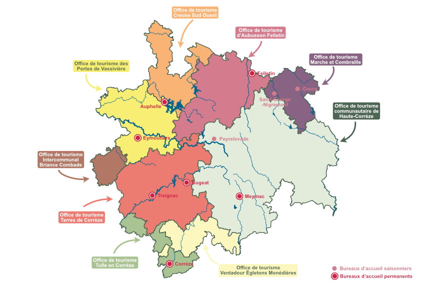 À travers l’appellation « Terres de Corrèze », ce sont les trois communautés de communes du Pays d’Uzerche, de Lubersac-Pompadour et de Vézère-Monédières-Millesources qui se sont réunies en un seul office de tourisme pour promouvoir le patrimoine de ce territoire. Quatre bureaux peuvent vous accueillir à Uzerche, Pompadour, Treignac et Bugeat.
